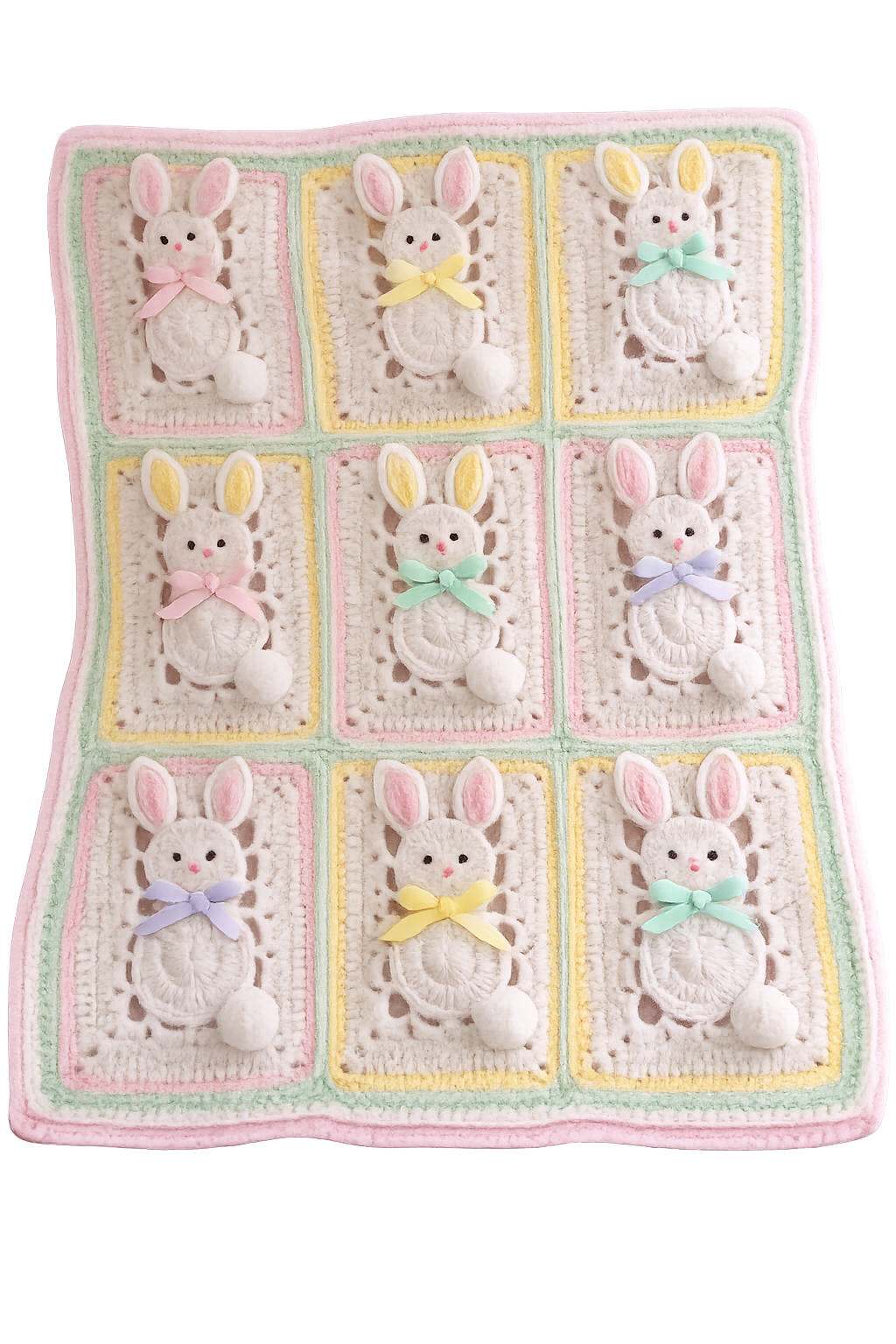 One of the most special things about this pattern is how customizable it is. You can mix and match pastel colors, choose different ribbon shades for the bows, and personalize the bunny faces to suit your style. Whether you’re an experienced crocheter or an enthusiastic beginner ready for a fun challenge, this project offers a rewarding experience and a beautiful finished blanket that families will treasure for years. At the end of this article, you can provide your readers with the free PDF pattern so they can easily follow along and start crocheting their own adorable bunny blanket.