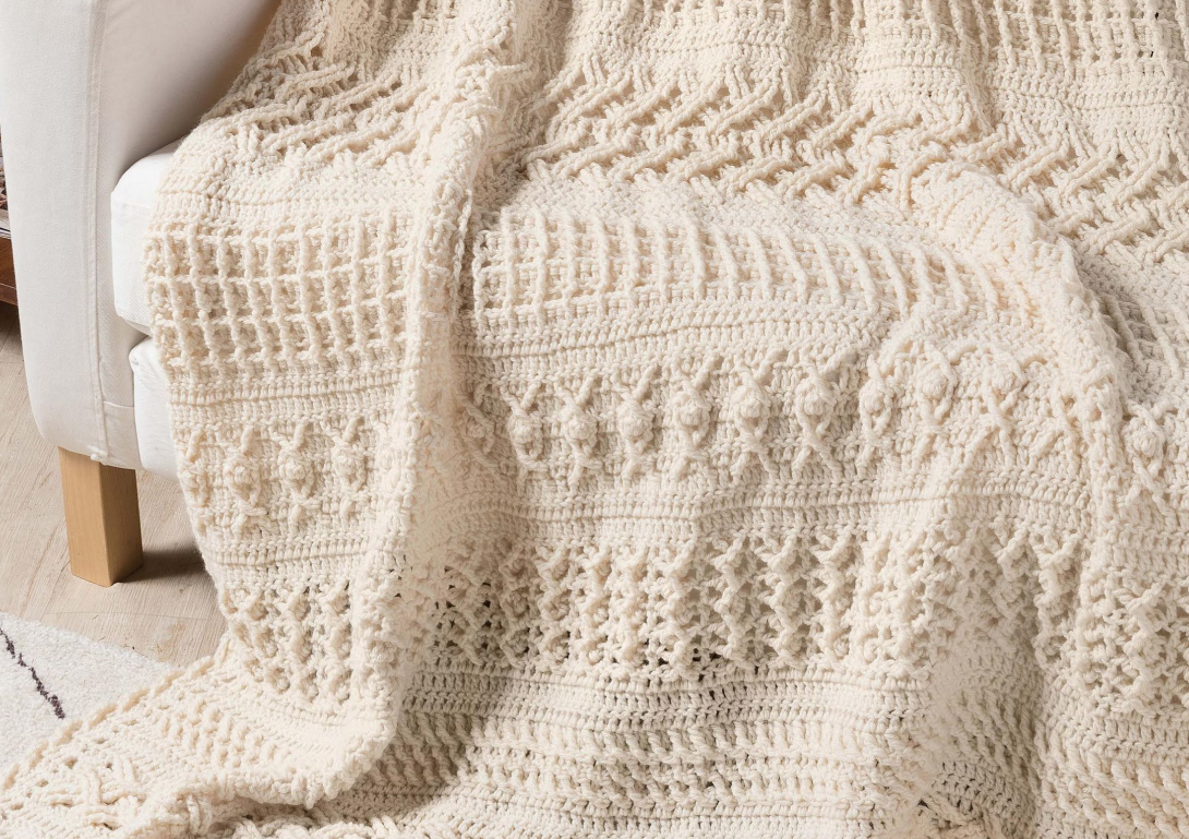 This intermediate-level pattern is perfect for crocheters who want to explore new stitches and enjoy techniques like front and back post crochet, slanted triple trebles, and bobble stitches. Worked in a creamy “Fisherman” shade, the afghan showcases every cable beautifully, but it will look equally stunning in any light, solid color that highlights texture.