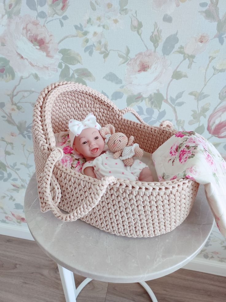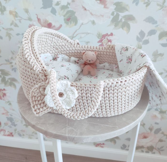 This crochet Moses basket is intended for supervised use only. Always place the basket on a stable surface and never carry a baby inside without proper structural support.