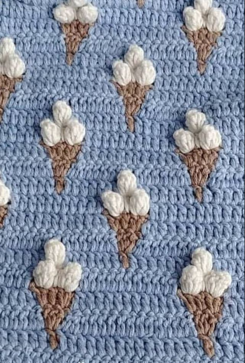 The Ice Cream Crochet Stitch is a beautiful three-dimensional pattern that creates a playful texture, perfect for baby blankets, garments, and decorative projects. Inspired by a handmade blanket seen on social media, this stitch combines double crochet clusters and popcorn stitches to form adorable “ice cream cones” across the fabric.
