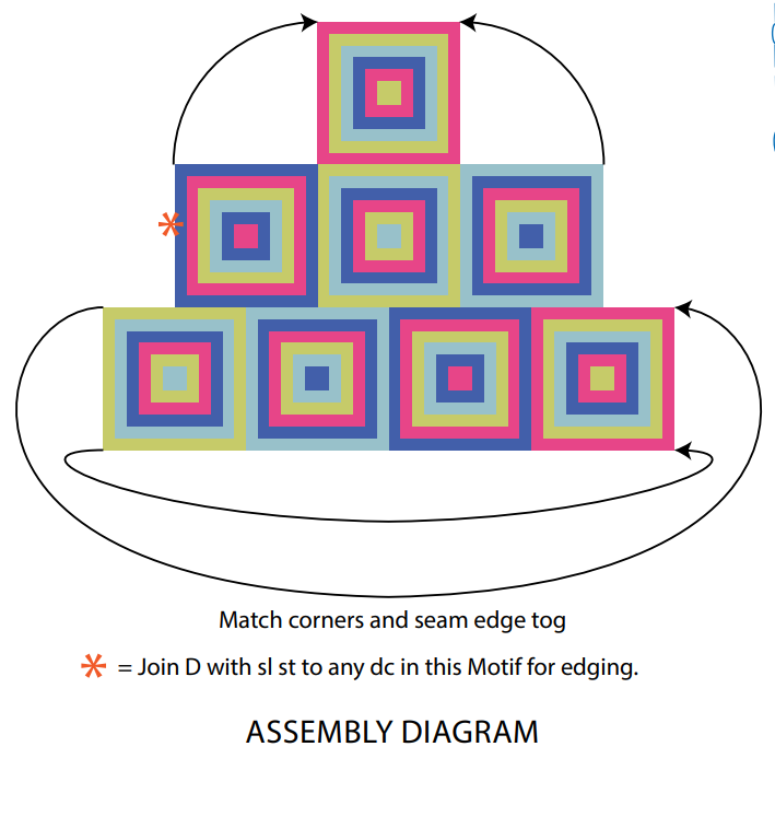 Join Color D with sl st to any dc of the motif indicated on your assembly layout.