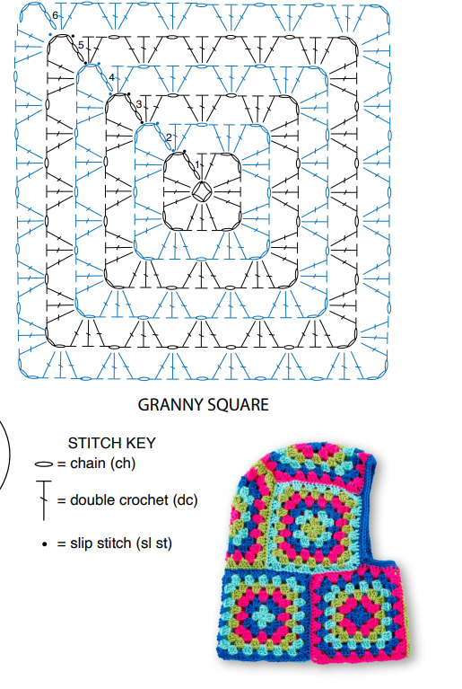 This balaclava is made from 8 granny square motifs, worked in four different color sequences to create a balanced and eye-catching design. All rounds are joined with a sl st to the 3rd chain of ch-5, unless otherwise indicated.